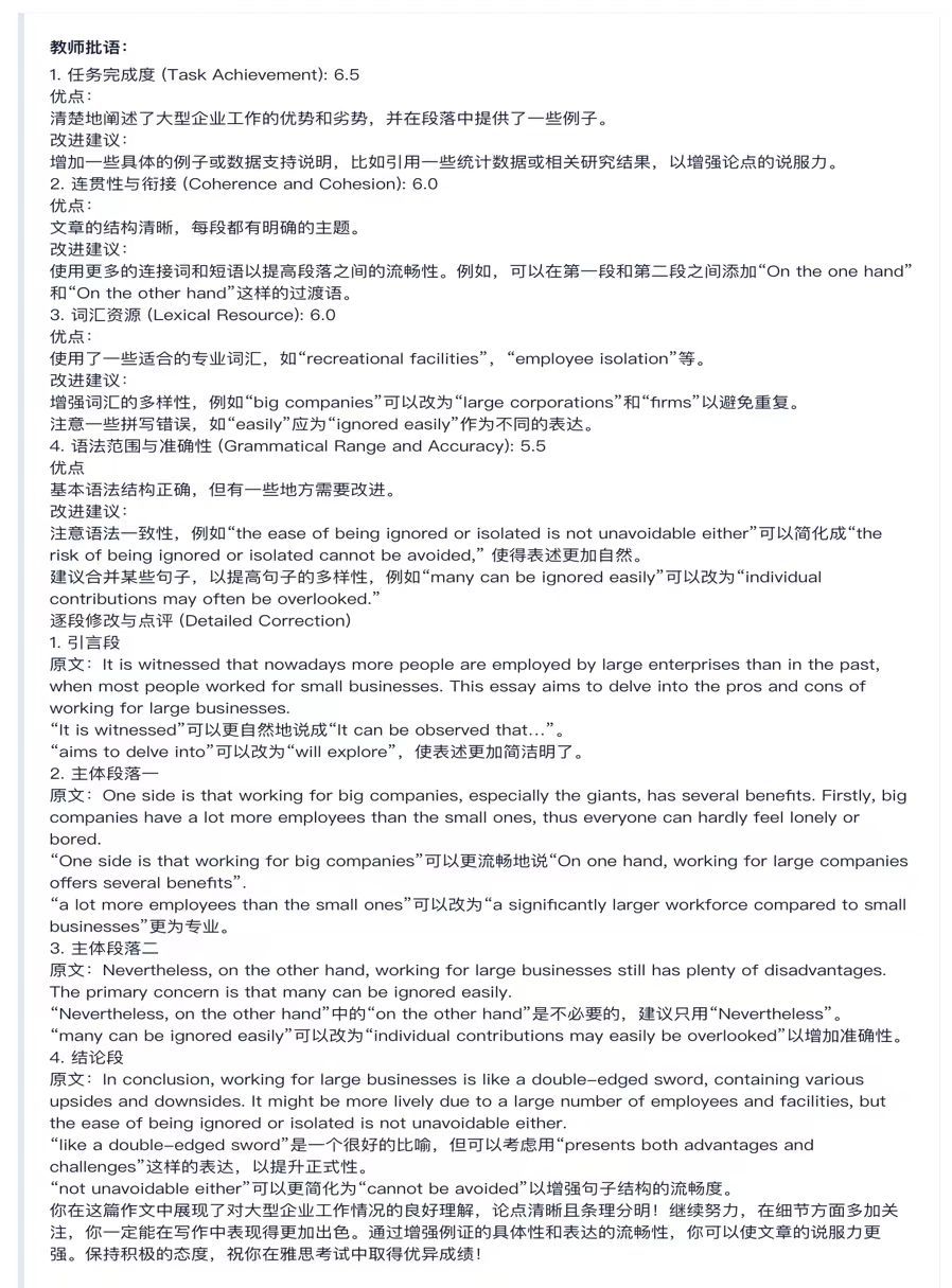 与此同时,我们始终保持着高频次的写作练习,牢牢稳住了写作手感,避免生疏卡顿。Jackie老师的作文批改更是精准细致,她严格按照雅思写作四大评分标准:Task Achievement, Coherence and Cohesion, Lexical Resource, Grammatical Range and Accuracy。逐篇剖析作文的优缺点,给出切实可行的改进建议,这让我们后续修改作文时更有方向、得心应手。